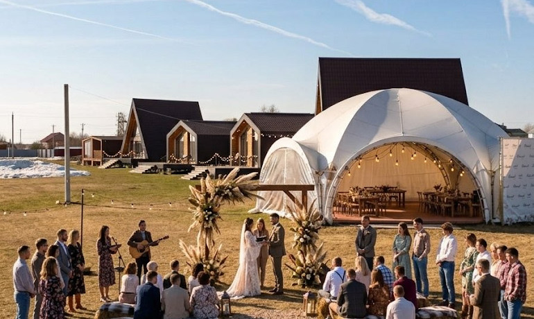 - просторный шатер (20–25 человек в закрытом формате, до 50+ при фуршете и уличной зоне),