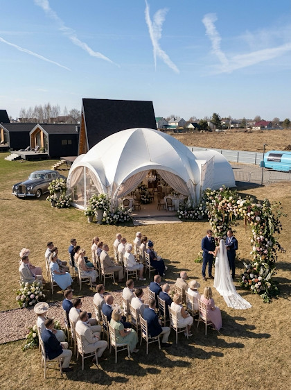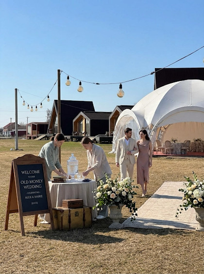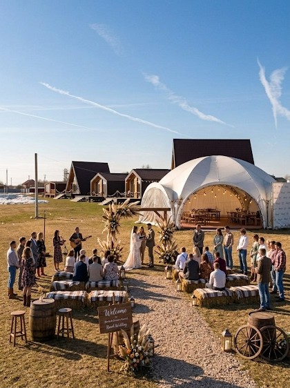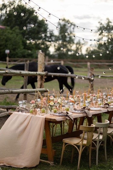 шатер на 20–30 человек, сцена, возможность провести фестивальную свадьбу на 50 человек, свадьбу на ранчо или классическую свадьбу на природе. Доступны авторские шоу — цирковое и «Гусарская баллада». Кейтеринг на любой вкус, открытое барбекю, фотосессия с лошадьми, катание на каретах, торжественный выход жениха и невесты в карете.